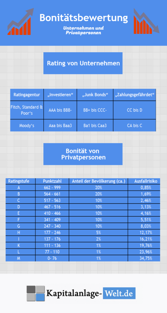 Infografik: Rating-Systeme bekannter Agenturen und Bonitätsbewertung bei Unternehmen und Privatpersonen